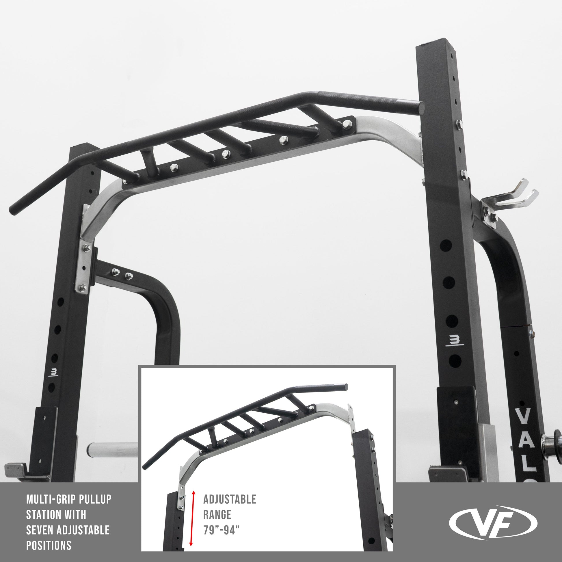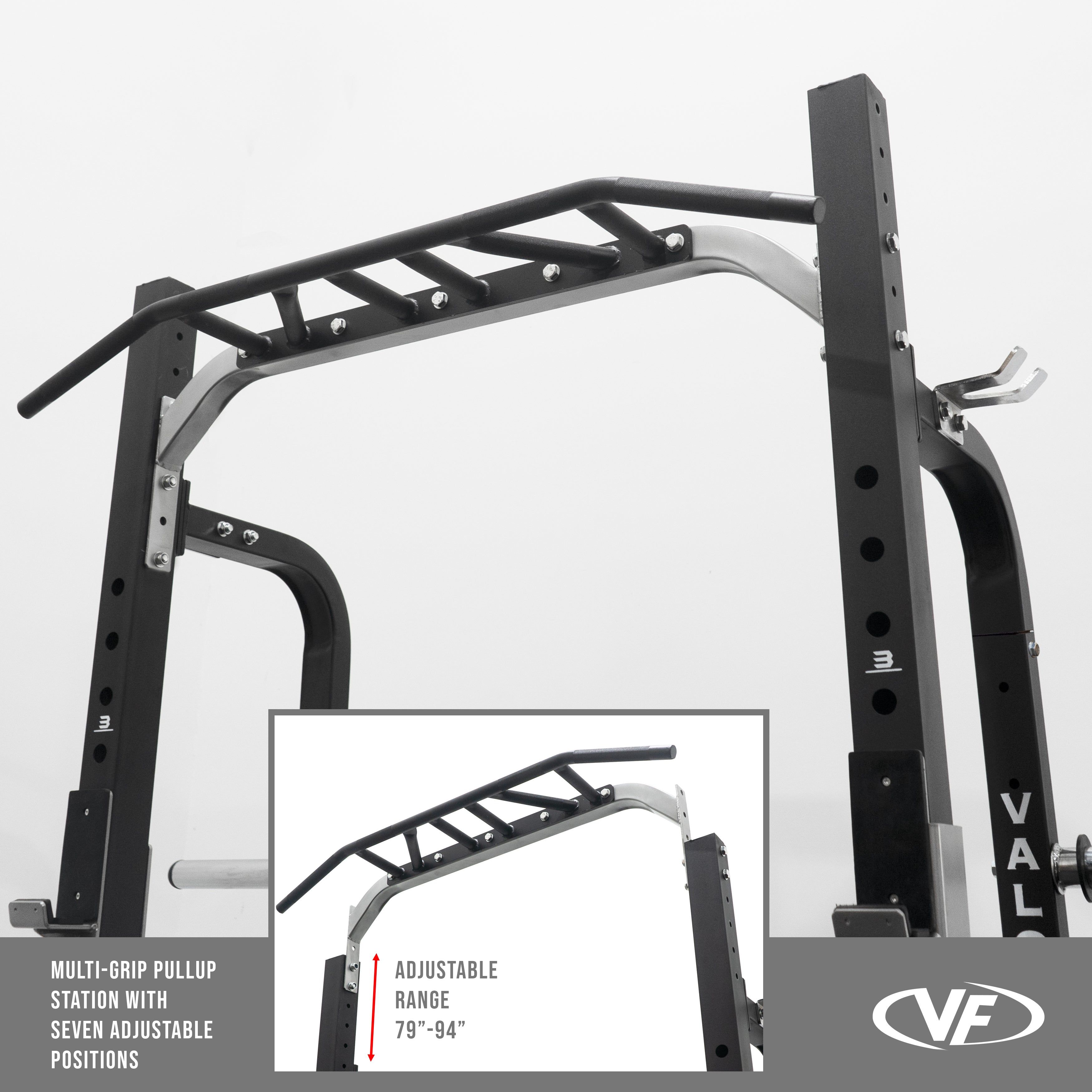 - MULTI-GRIP PULL UP STATION: Equipped with a multi-grip pull-up bar, this rack allows you to perform pull-ups and chin-ups in up to 5 different positions. Adjustable from 79" to 94", the bar accommodates various exercises and user heights, targeting back, arm, and shoulder muscles.