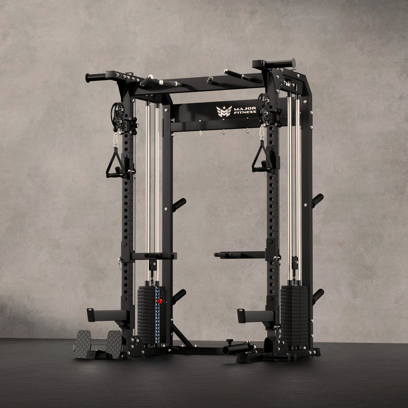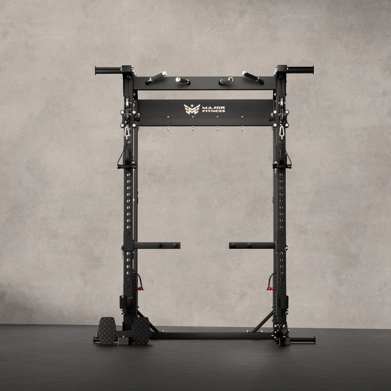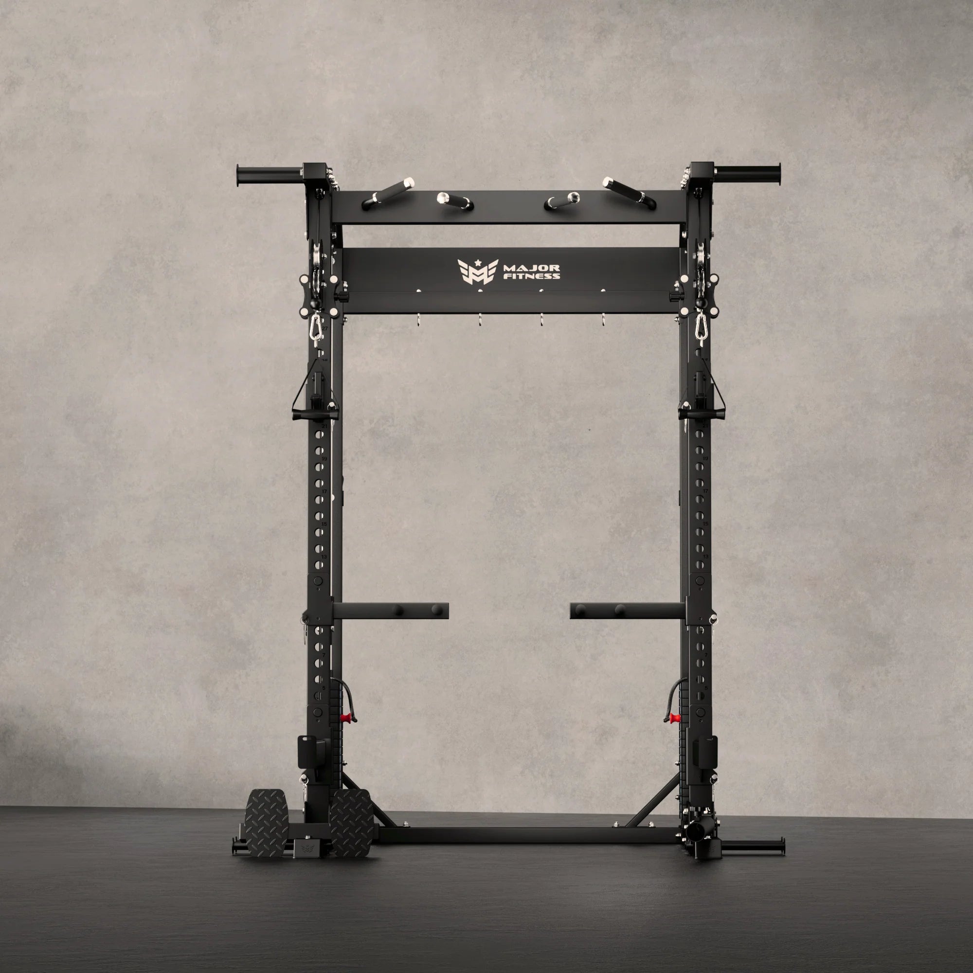 The MAJOR FITNESS F22 All-In-One Home Gym Power Rack by Major Fitness is a 4-in-1 multifunctional strength station built for serious home gym athletes. It combines a power rack, dual cable pulley functional trainer, multi-grip pull-up bar, and landmine attachment into a compact, high-performance system.