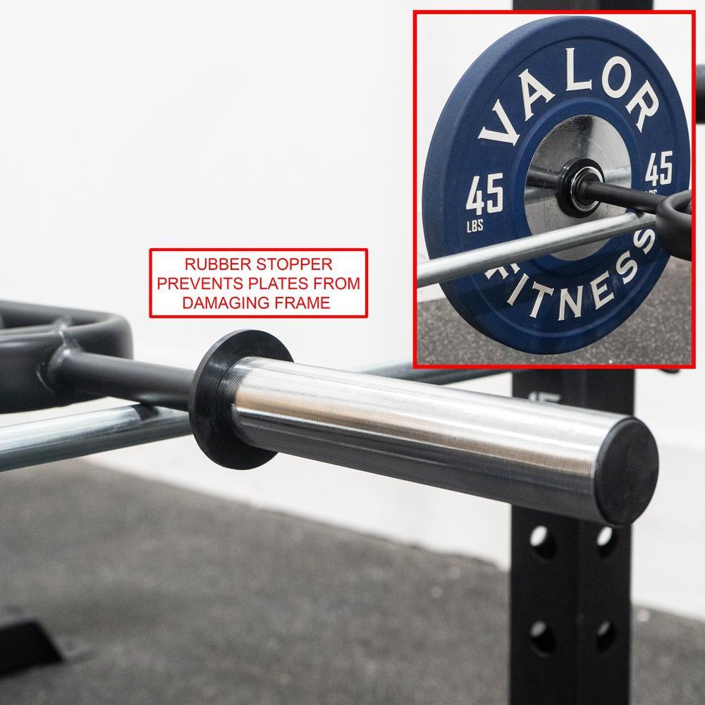 - RUBBER STOPPERS: Rubber stoppers sit between the sleeves and bar frame to protect your plates and bar from damage during loading and lifting.