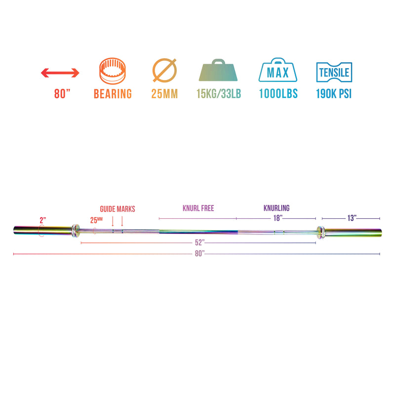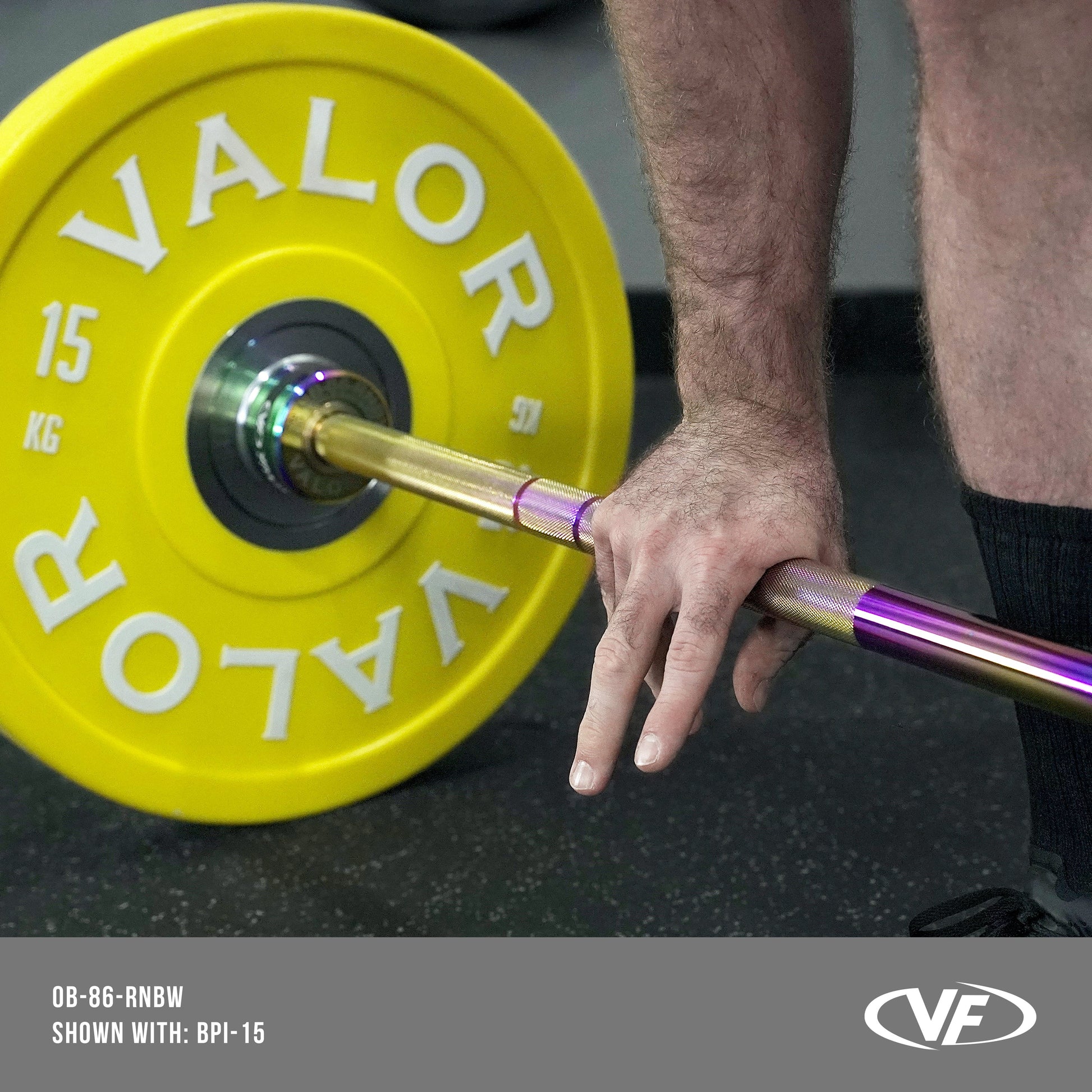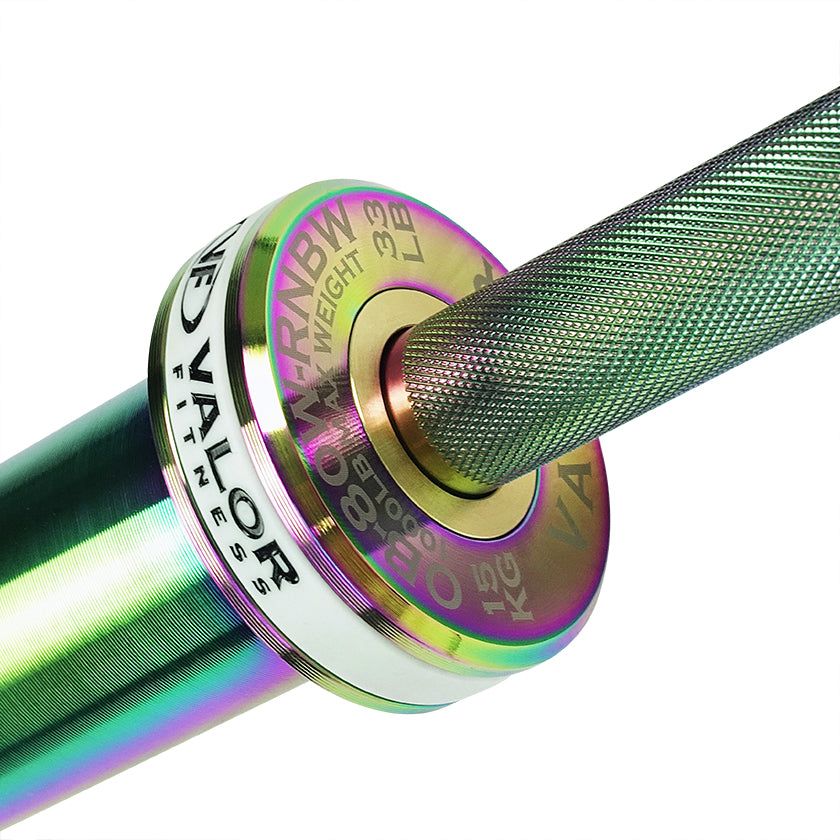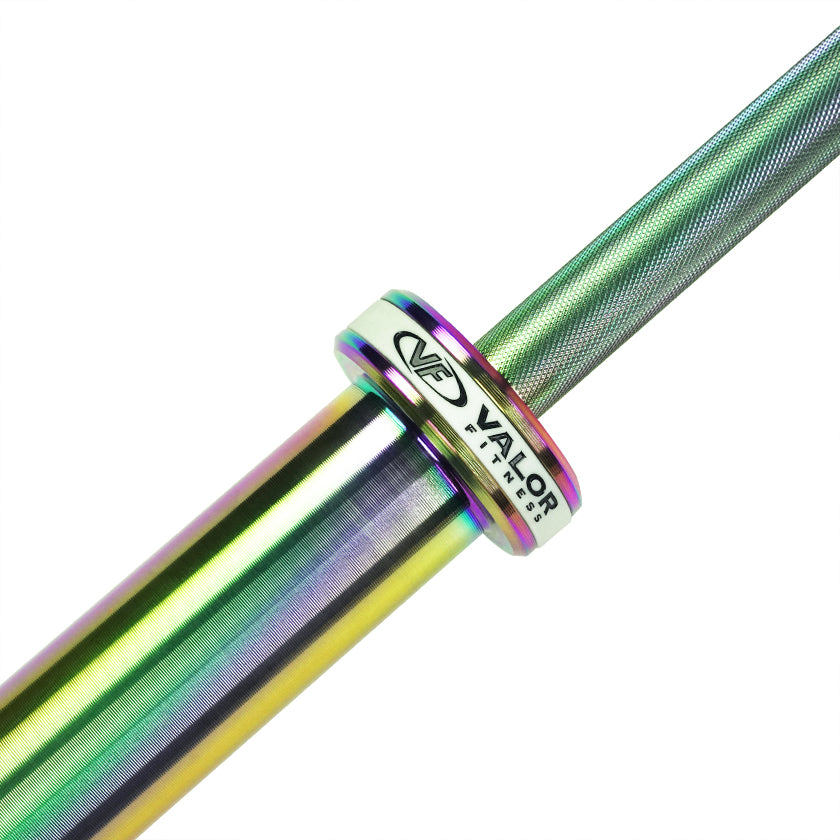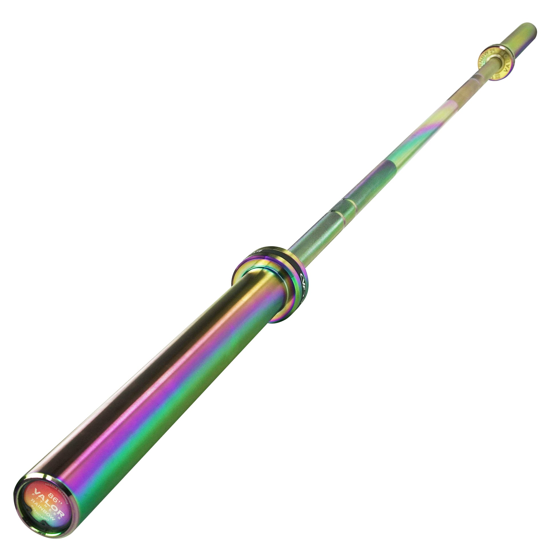 Stand out while you max out with the Valor Fitness Rainbow Titanium Needle Bearing Barbell—where jaw-dropping design meets peak performance. Available in two sizes—86.5" (44 lb) and 80.5" (33 lb)—this rainbow barbell features a stunning holographic titanium finish that turns heads in the gym while delivering the durability and performance serious lifters demand. Whether you're chasing PRs or just want gear that looks as strong as you lift, this is your go-to colored Olympic barbell.