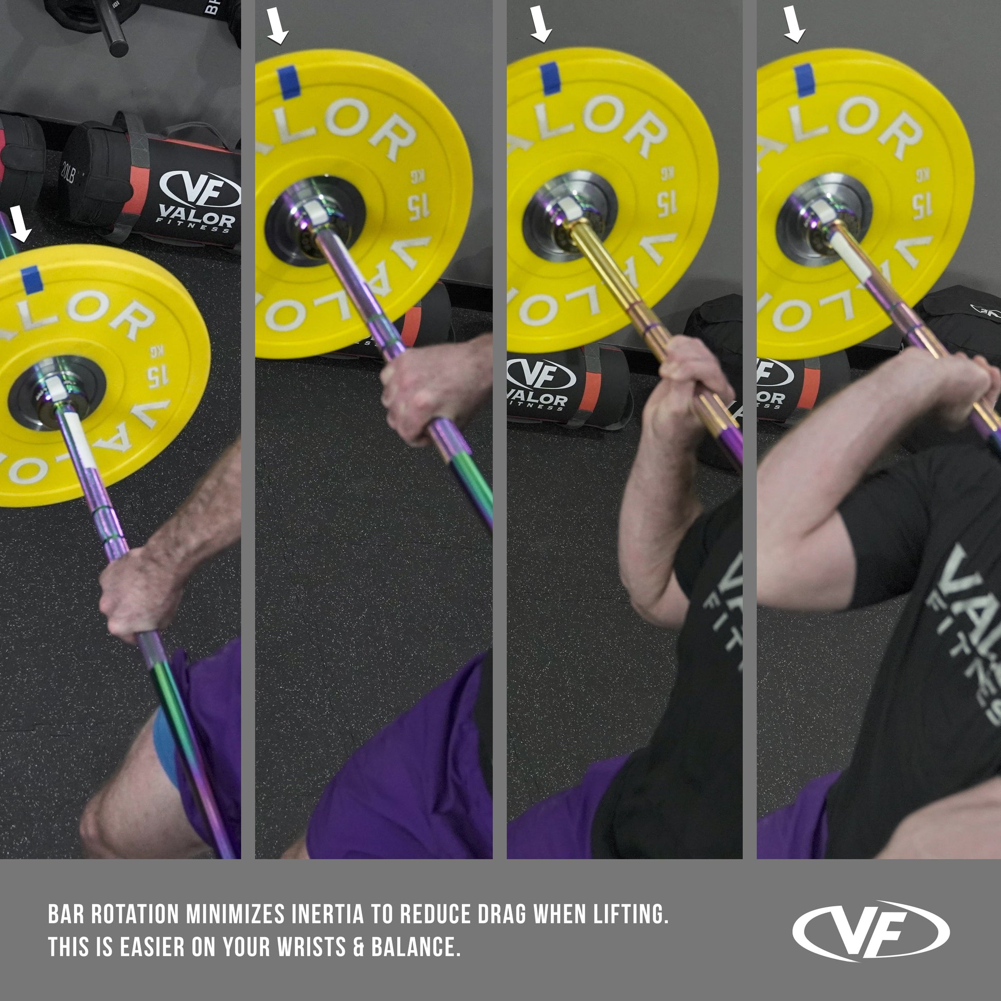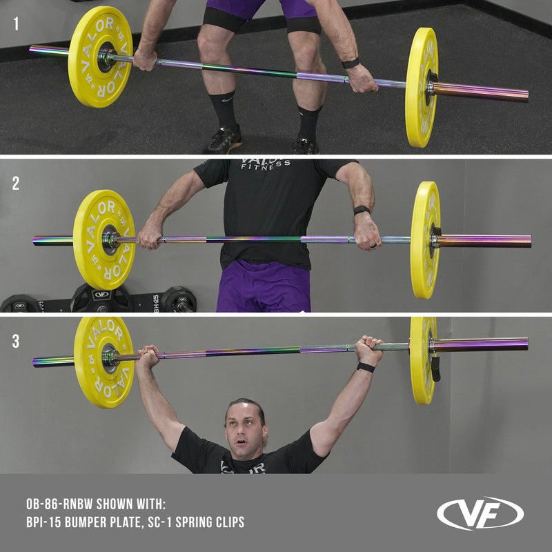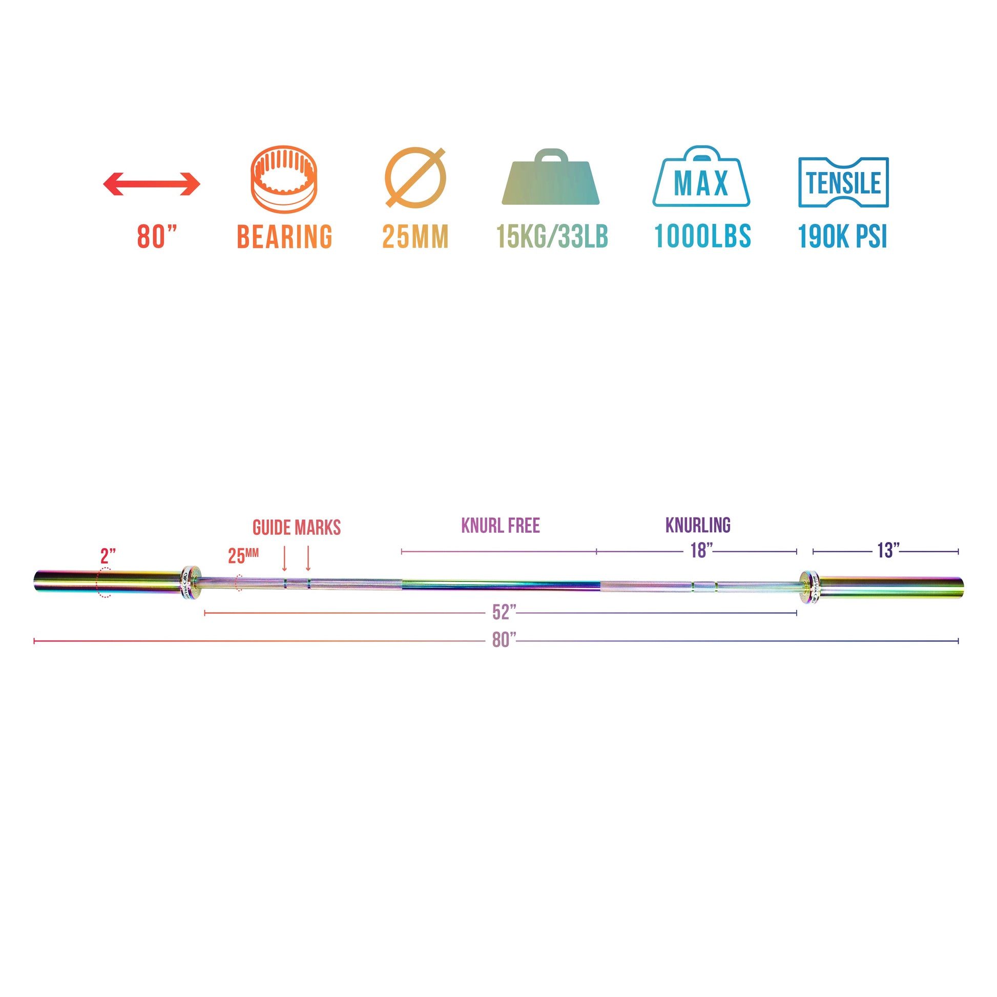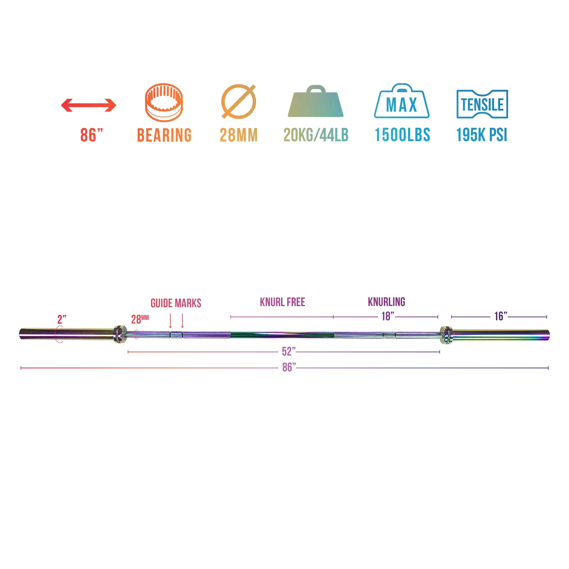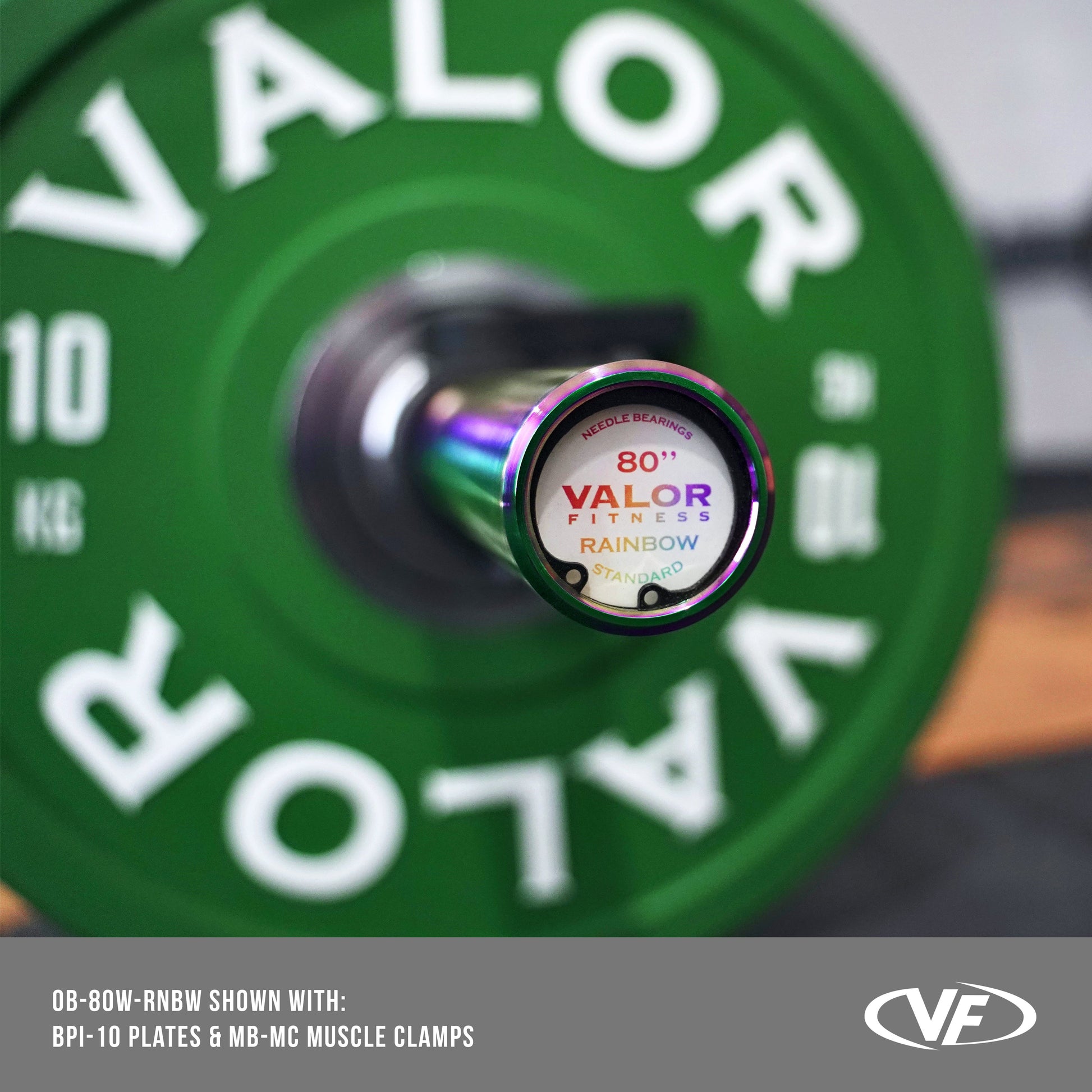 Stand out while you max out with the Valor Fitness Rainbow Titanium Needle Bearing Barbell—where jaw-dropping design meets peak performance. Available in two sizes—86.5" (44 lb) and 80.5" (33 lb)—this rainbow barbell features a stunning holographic titanium finish that turns heads in the gym while delivering the durability and performance serious lifters demand. Whether you're chasing PRs or just want gear that looks as strong as you lift, this is your go-to colored Olympic barbell.