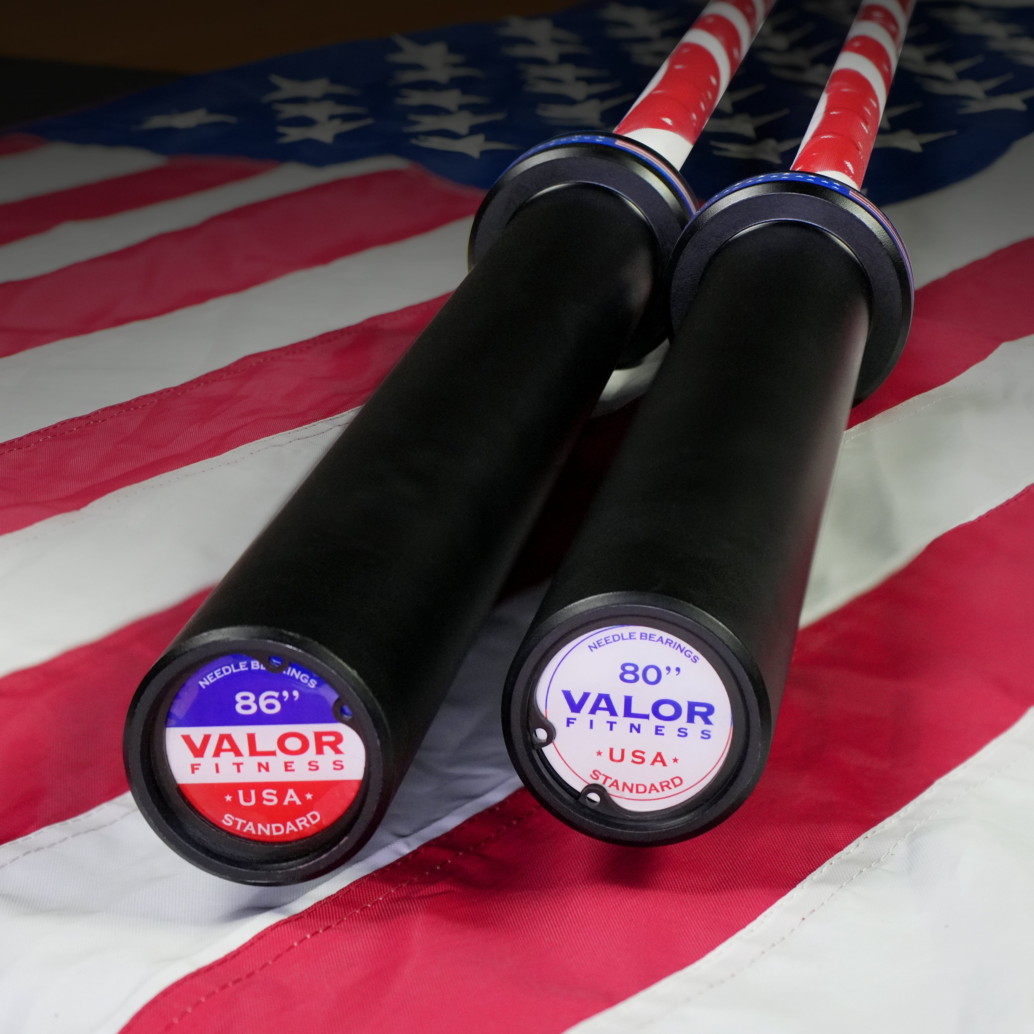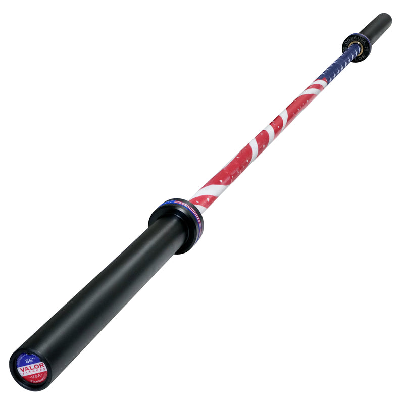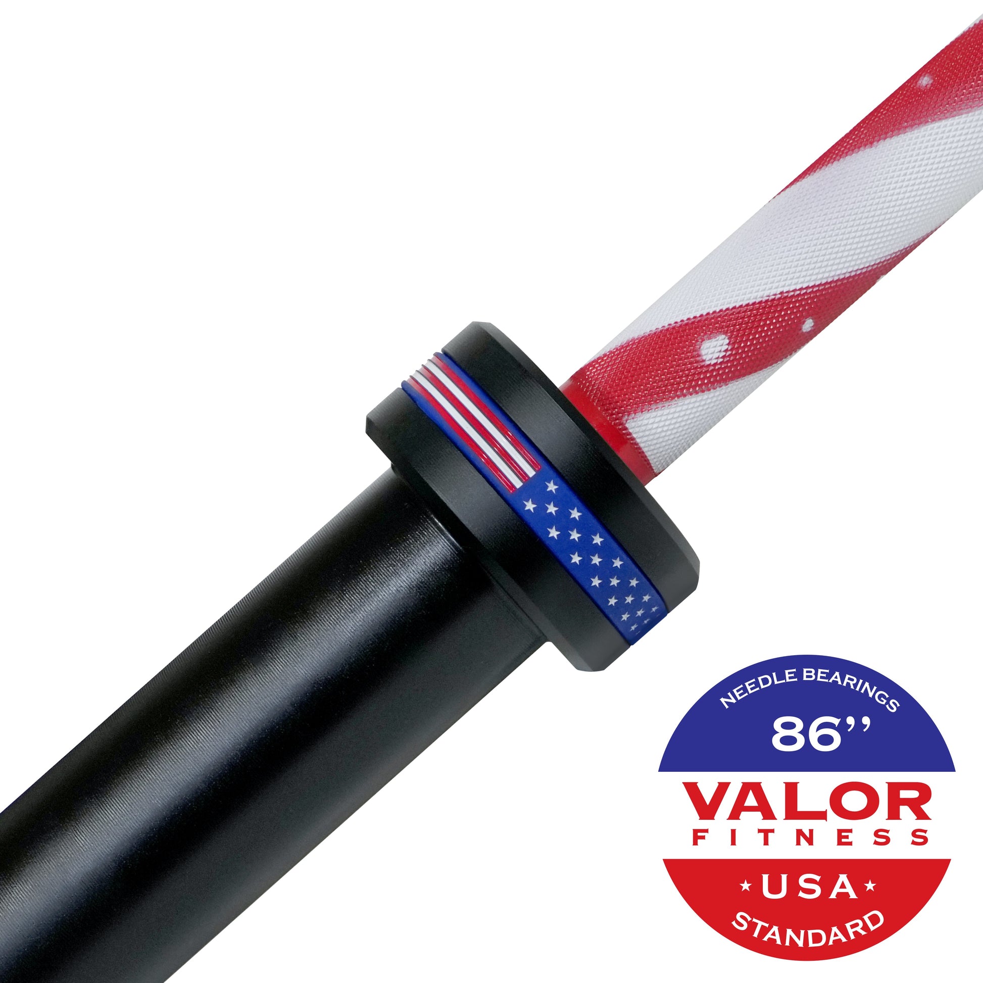 Salute your strength and showcase your commitment with the Valor Fitness American Flag Needle-Bearing Barbell. This bold USA barbell comes in two sizes—86.5" (44 lb) and 80.5" (33 lb)—both finished with a vivid American flag design. Unlike printed or etched graphics, this full-coverage coating delivers a smooth, vibrant look that won’t fade or flake under pressure. With seamless needle-bearing rotation, high-tensile steel, and balanced knurling, this flag barbell is made to perform—whether you’re powering through Olympic lifts or daily strength sessions.
