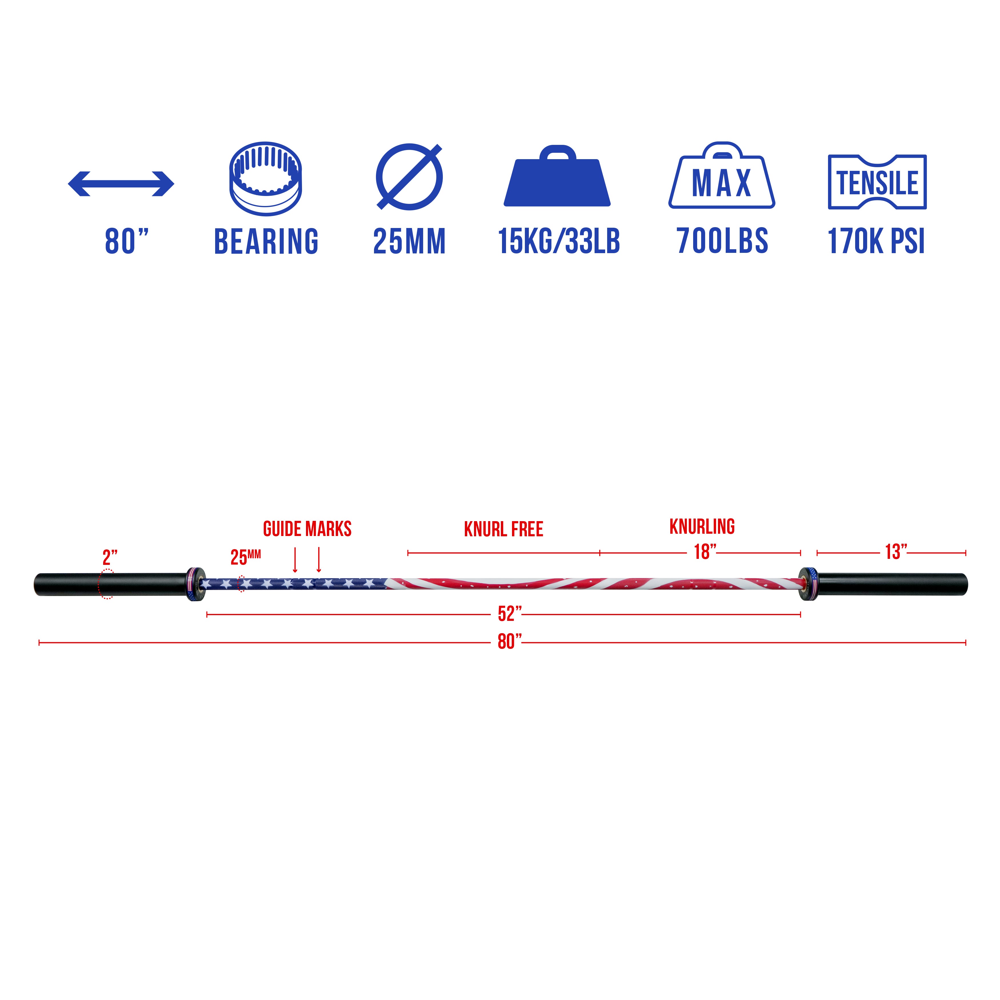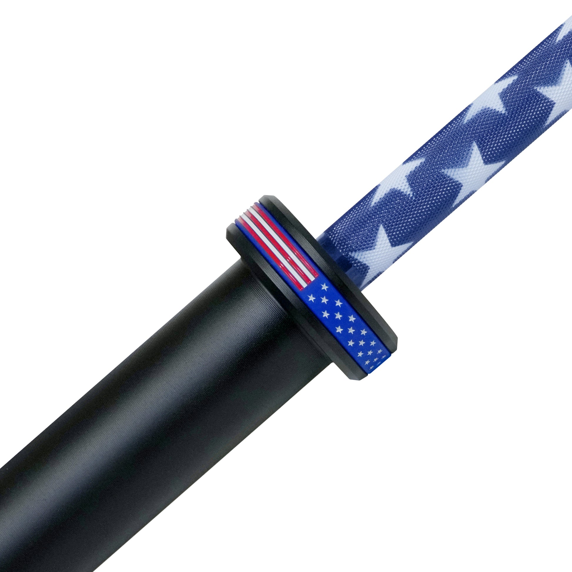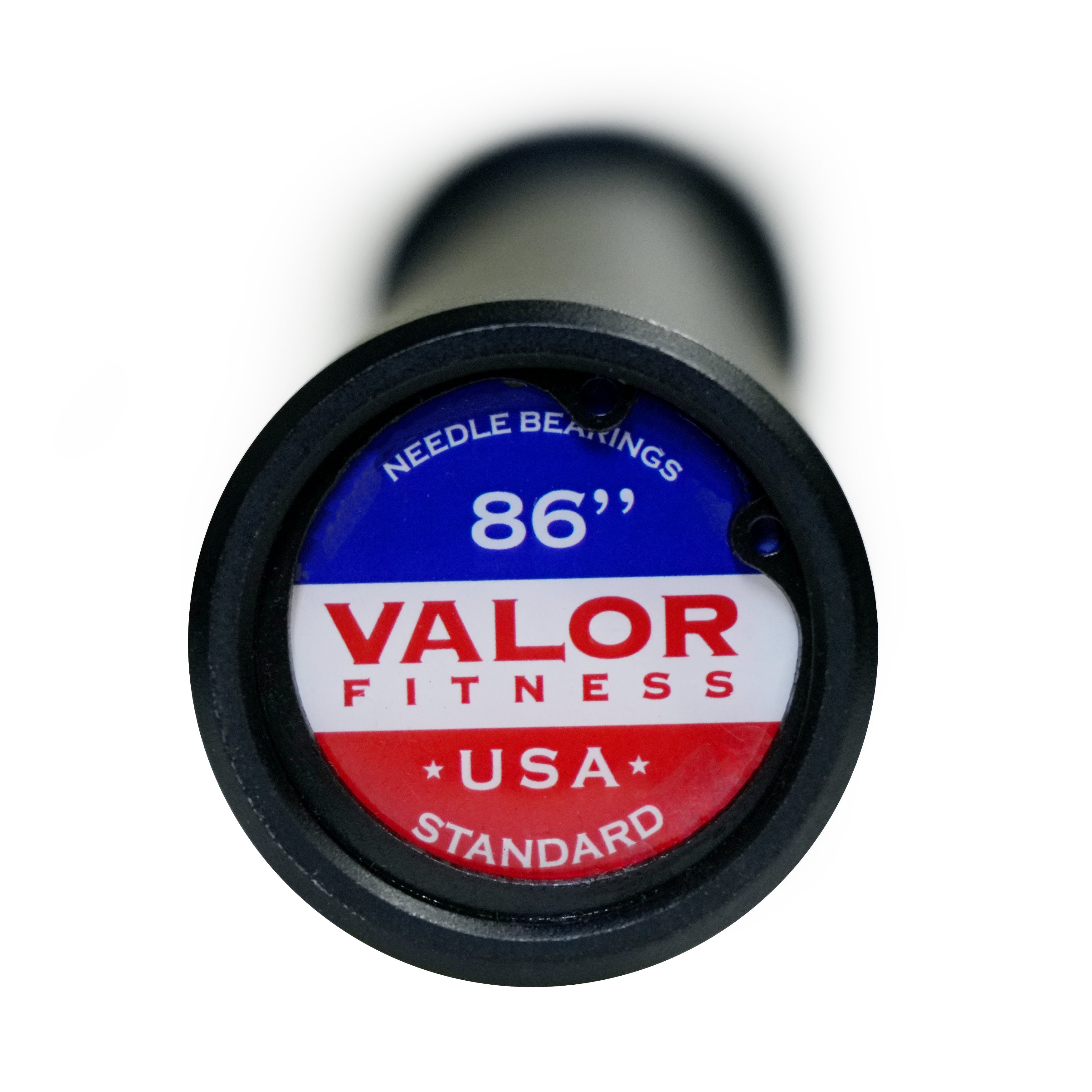 Salute your strength and showcase your commitment with the Valor Fitness American Flag Needle-Bearing Barbell. This bold USA barbell comes in two sizes—86.5" (44 lb) and 80.5" (33 lb)—both finished with a vivid American flag design. Unlike printed or etched graphics, this full-coverage coating delivers a smooth, vibrant look that won’t fade or flake under pressure. With seamless needle-bearing rotation, high-tensile steel, and balanced knurling, this flag barbell is made to perform—whether you’re powering through Olympic lifts or daily strength sessions.